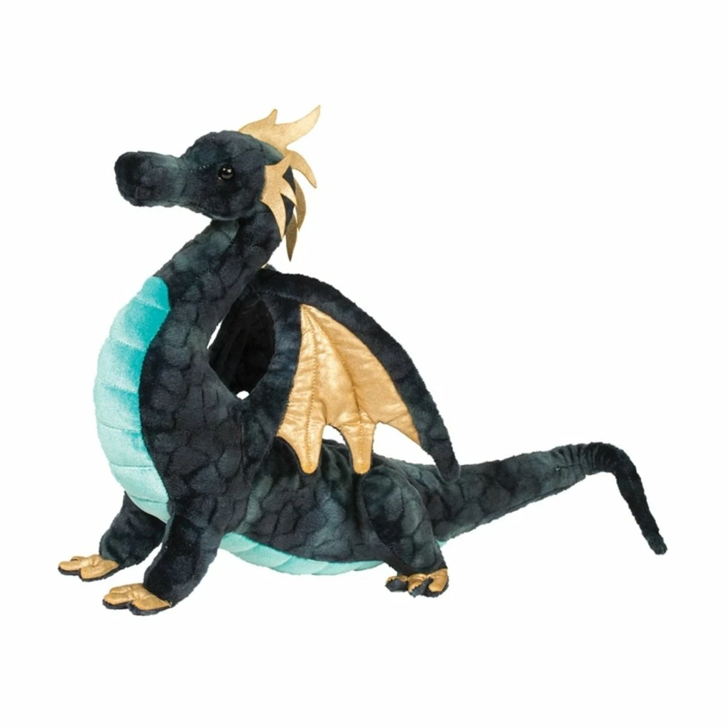 Bring fairy tale adventures to life with our noble plush dragon, Aragon! Featuring an array of specially selected designer fabrics, this is one dragon stuffed animal that will stand out in a crowd. Aragon has been crafted with rich, navy colored plush material featuring a textured scale pattern for realistic fun. Bright turquoise scales run along his underside and metallic gold accents detail his crest, wings and feet. Aragon’s alert upright pose and graceful curves add a touch of elegance to this handsome dragon plush toy. Whether he plays the role of faithful guardian or worthy adversary, Aragon the plush dragon is sure to be a fun and exciting addition to any mythical quest!