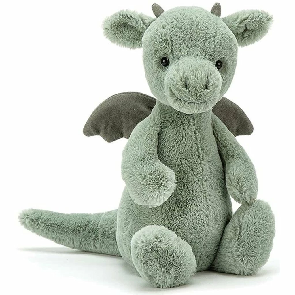- Jellycatยฎ Bashful Dragon has beans in his bottom so that he can sit, pose and breath fire, yikes! Bashful is an extremely fearsome Dragon with very floppy arms and loves to be cuddled.