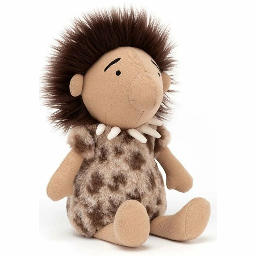 - Prehistoric Nev has short, brown, fuzzy hair and wears a brown leopard print smock, with a tooth necklace. He has a beany bottom, perfect for sitting upright on a shelf or on your bedside table.