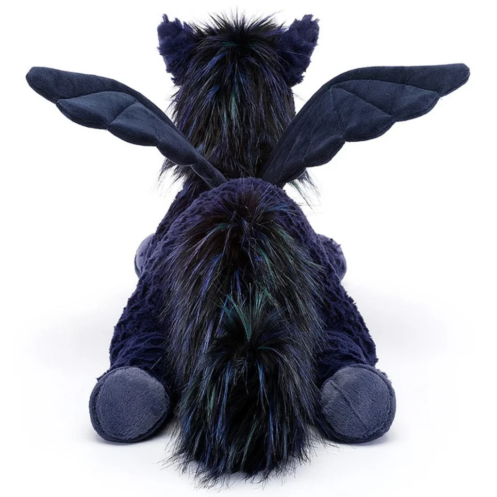 Seraphina Pegasus has come down to earth, but this swift sky-pony is dreaming of zooming! A magical mystery with midnight fur ruffled and scruffed by the chilly wind, Seraphina soars high on broad stitch wings. With soft sheen hooves, a snuggly muzzle and a fluffy mane streaked with electric blue, this Pegasus is perfect.