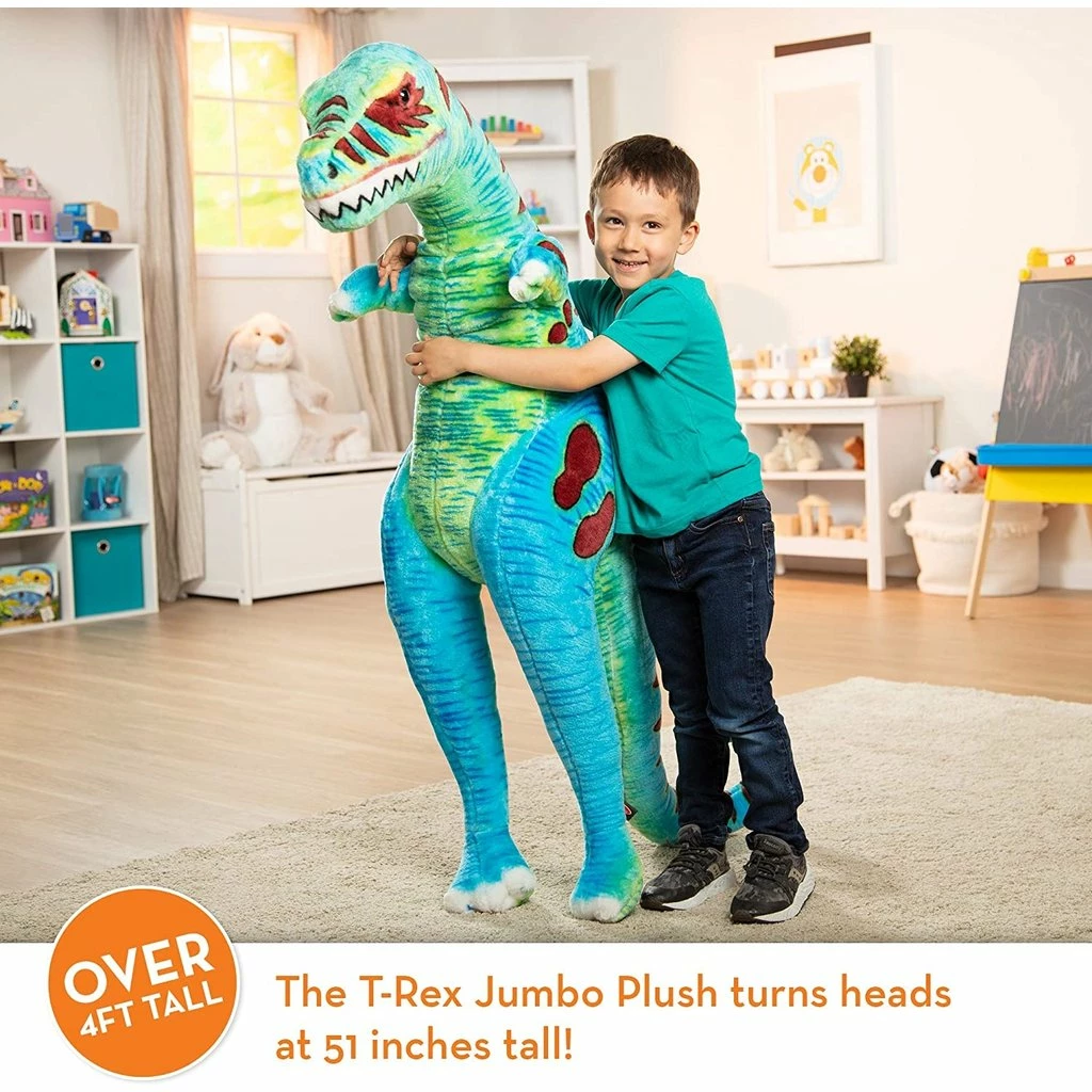 Make a big impression with this bold and exciting dinosaur that stands more than four feet tall! Covered with multi-colored plush in beautiful blues and greens, the lifelike Giant T-Rex is soft and squeezable, while sturdy, quality construction and a strong interior structure means it will stand tall and hold up to years of hugs and snuggling. Itβs long, curving tail and strong, powerful-looking legs help this dinosaur remain a steady and steadfast companion.