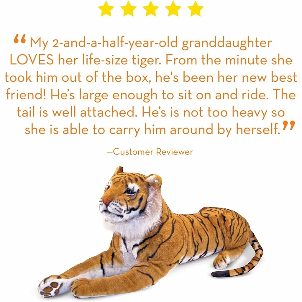 This beautifully crafted lifelike Siberian tiger is one cool cat! The gorgeous orange, white, and black-striped plush fur is both durable and incredibly soft to the touch, while the quality construction and a strong interior structure means it will hold up to years of hugs and snuggling. Incredibly detailedβfrom the tip of its tail, to the pads on its paws, to a face at once proud and lovableβthis exotic creature stretches proudly to a length of 72″ and is sure to delight animal lovers of all ages. This exotic and majestic tiger is perfect as a stunning decorative piece for any room, as well as a catalyst for imaginary adventures into the heart of the jungle! It will spark the imagination, promote creative play, and is sure to be a beloved member of any childβs menagerie!
