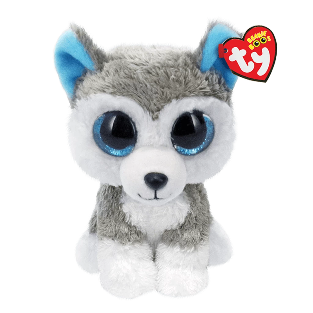 Slush the husky from the TYยฎ Beanie Boosโข collection, is silky soft and smiling your way. He’s wagging his tail and asking you to come play. His grey and white fur, blue ears and tail, and solid blue eyes are sure to make him a favorite of kids and collectors alike! The attached tag reads: